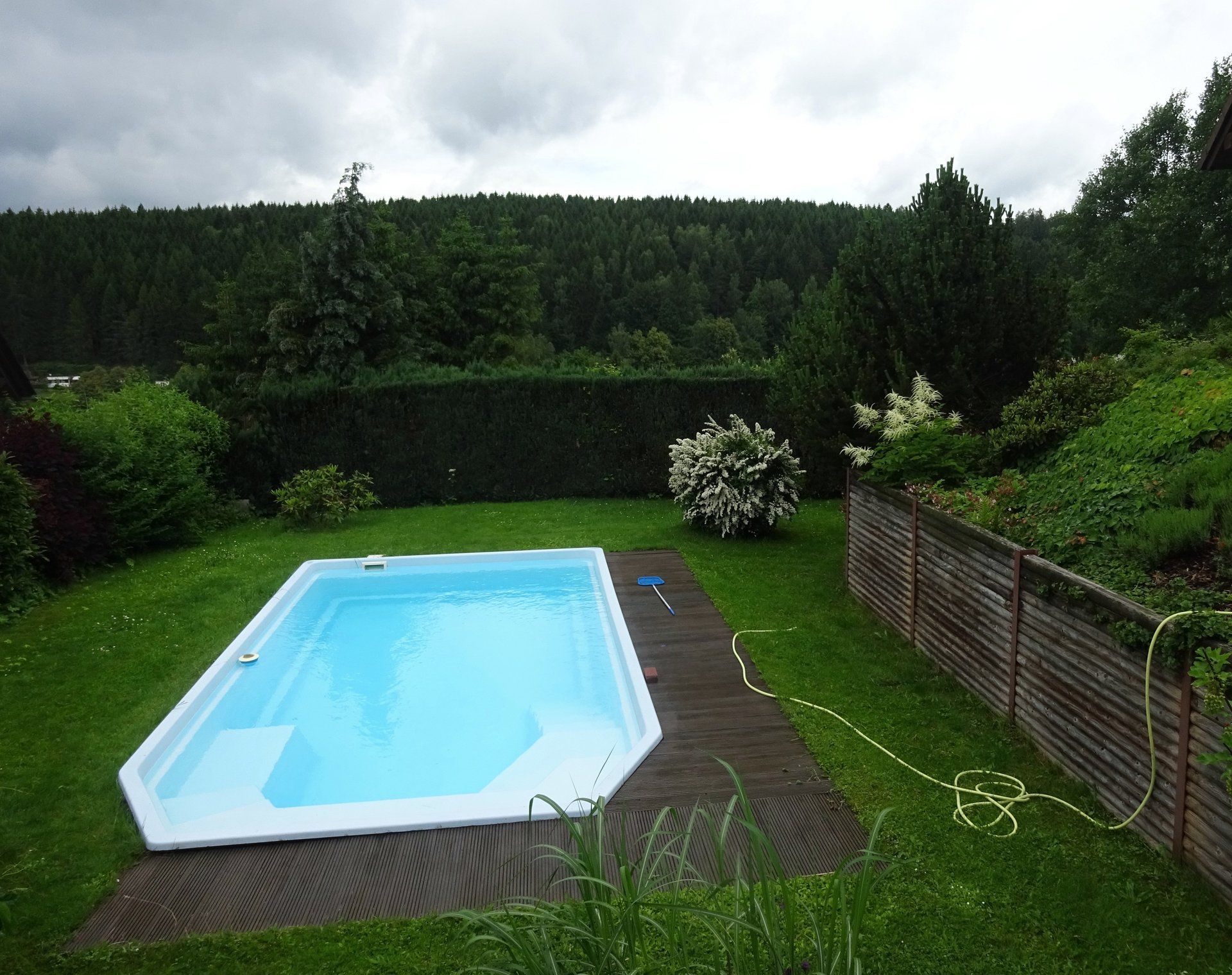 Im Sommer können Sie gern unseren Swimmingpool benutzen und es sich auf der Rasenfläche vor der Ferienwohnung mit Gartenmöbeln und Liegen gemütlich machen.